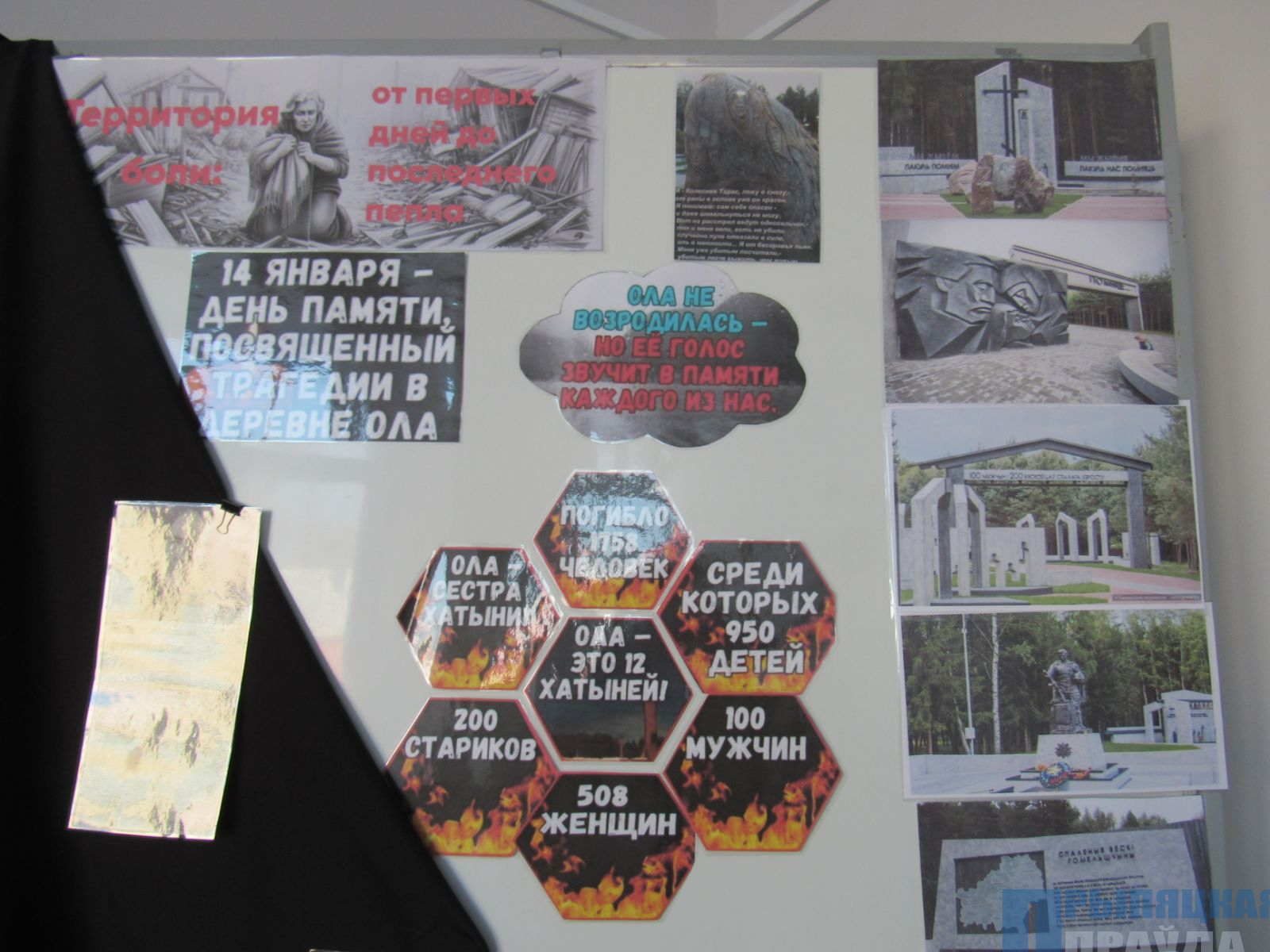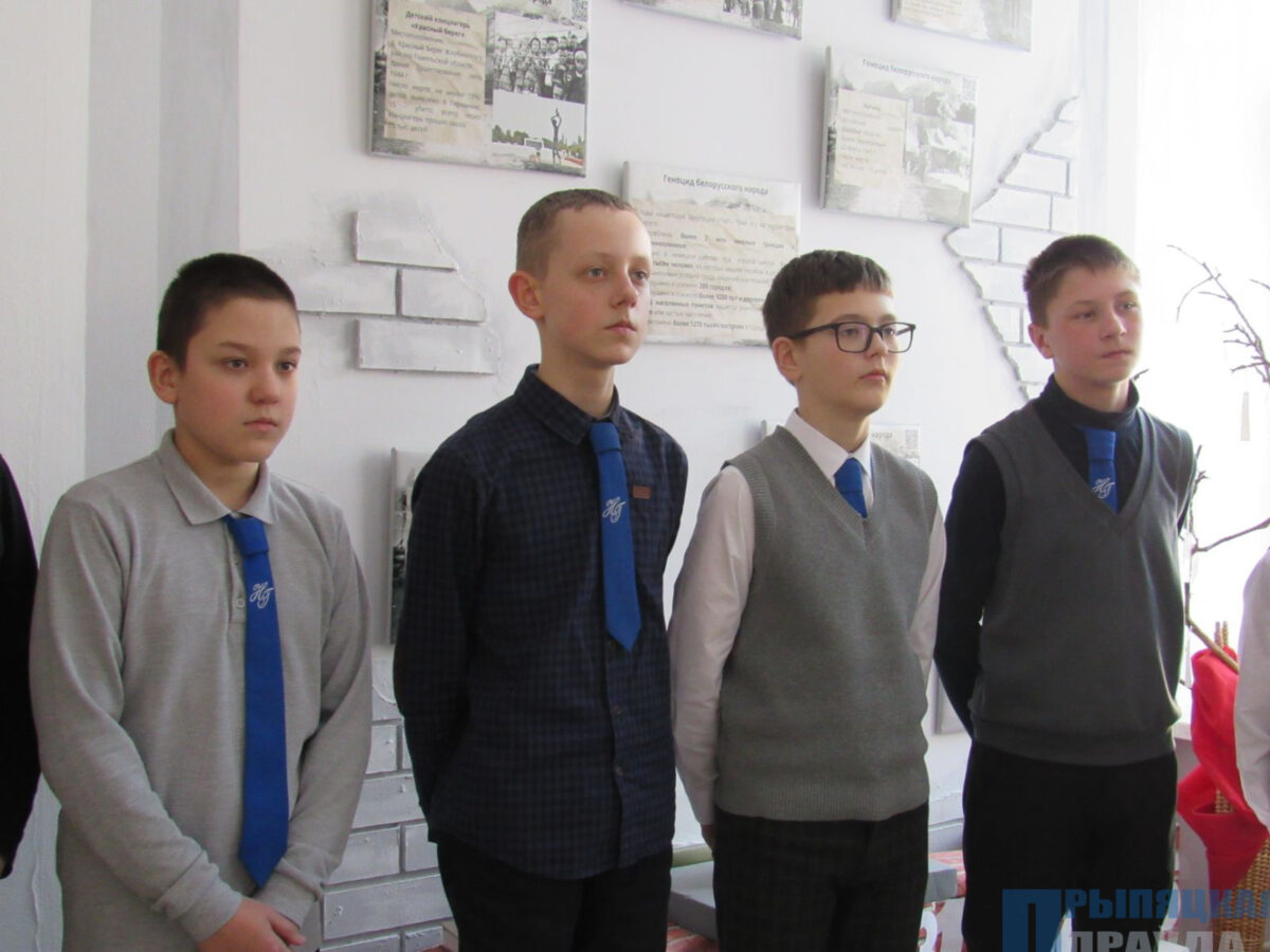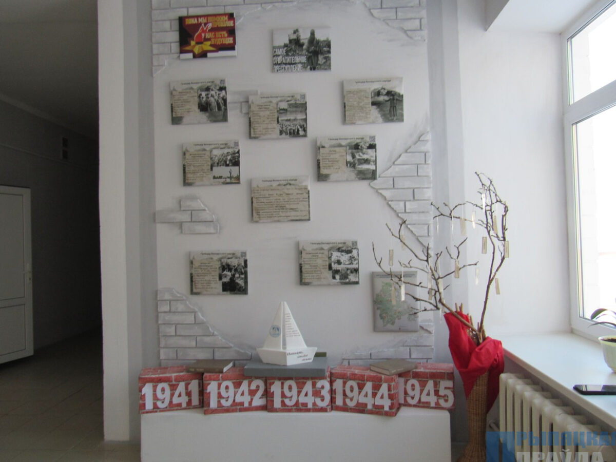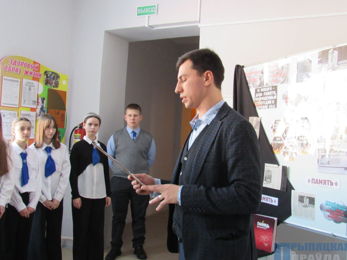 В гимназии также в этот день вспоминали эту страшную трагедию. Для учащихся 7 класса руководитель по военно-патриотическому воспитанию Арктур Павлов провел урок памяти, посвященный геноциду белорусского народа на примере деревни Ола. Арктур Леонидович организовал выставку и рассказал о жизни деревни до войны, ознакомил с документальными материалами и с воспоминаниями немногих выживших.
