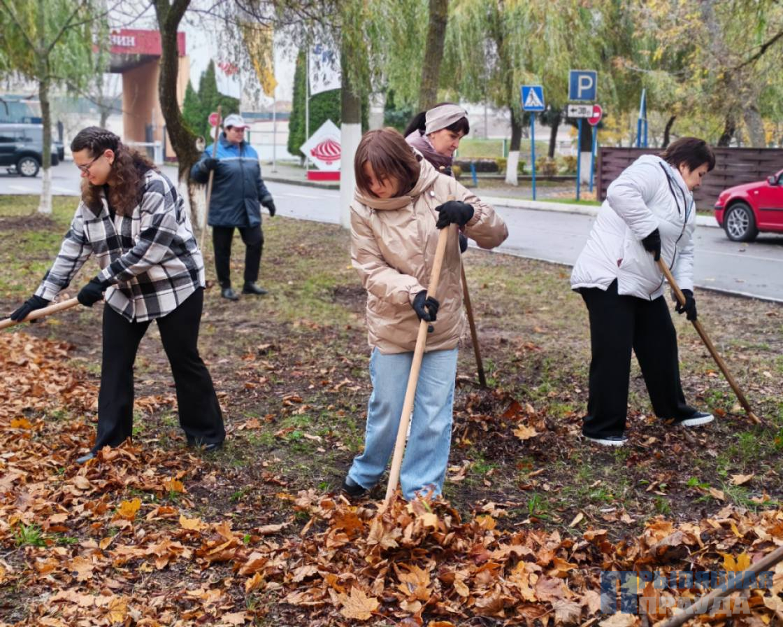 А вдоль улицы Макаренко усердно трудились учащиеся колледжа, очищая территорию от листвы.