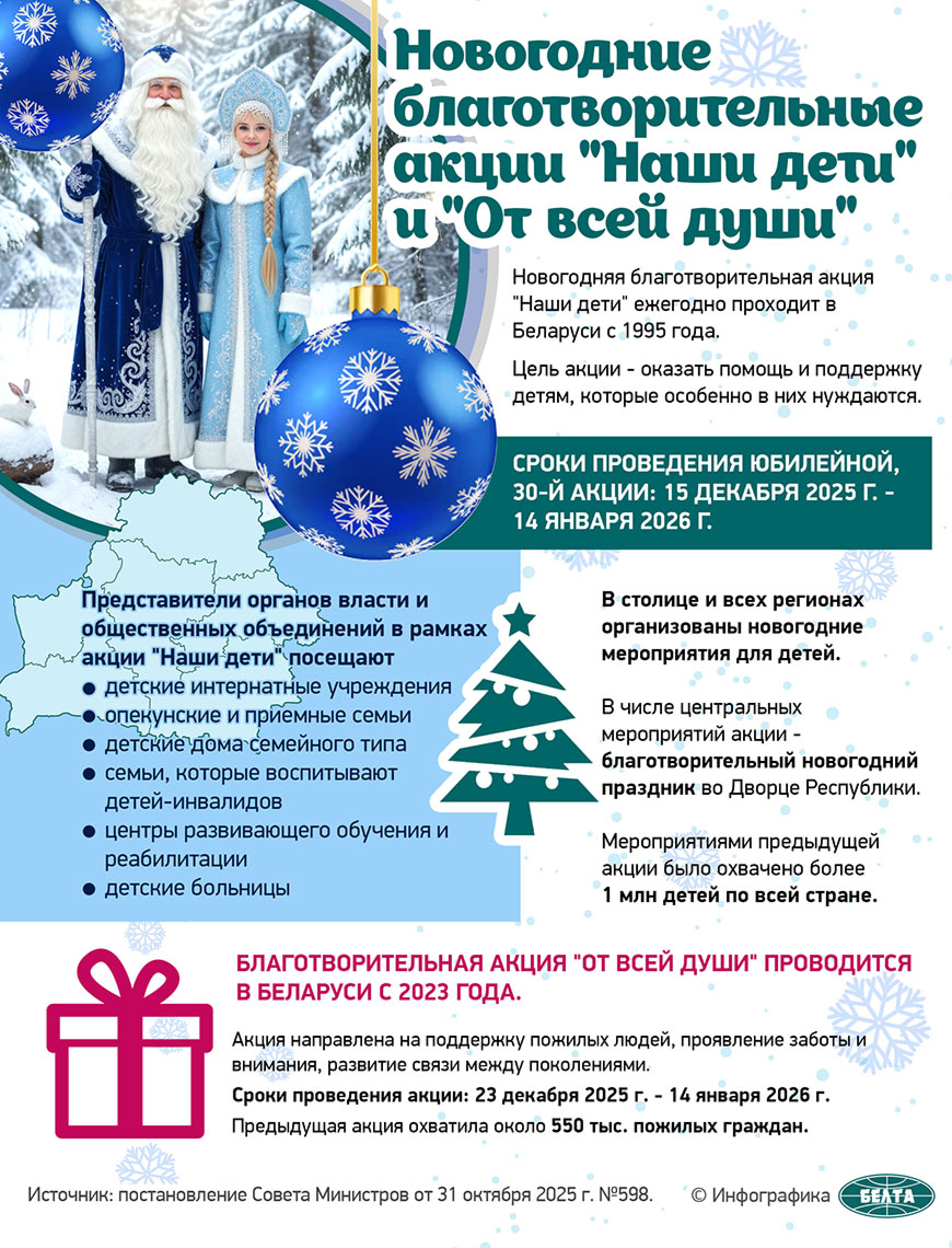 «Сегодня мы начинаем новогодние торжества и даем старт нашей традиционной благотворительной акции «Наши дети». Вскоре к ней присоединится и второй государственный проект — «От всей души», который ориентирован на пожилых людей. Это традиция. Когда в общности людей есть традиции, значит, эта общность состоялась. А в нашей стране таких традиций много», — подчеркнула заместитель премьер-министра Беларуси Наталья Петкевич.