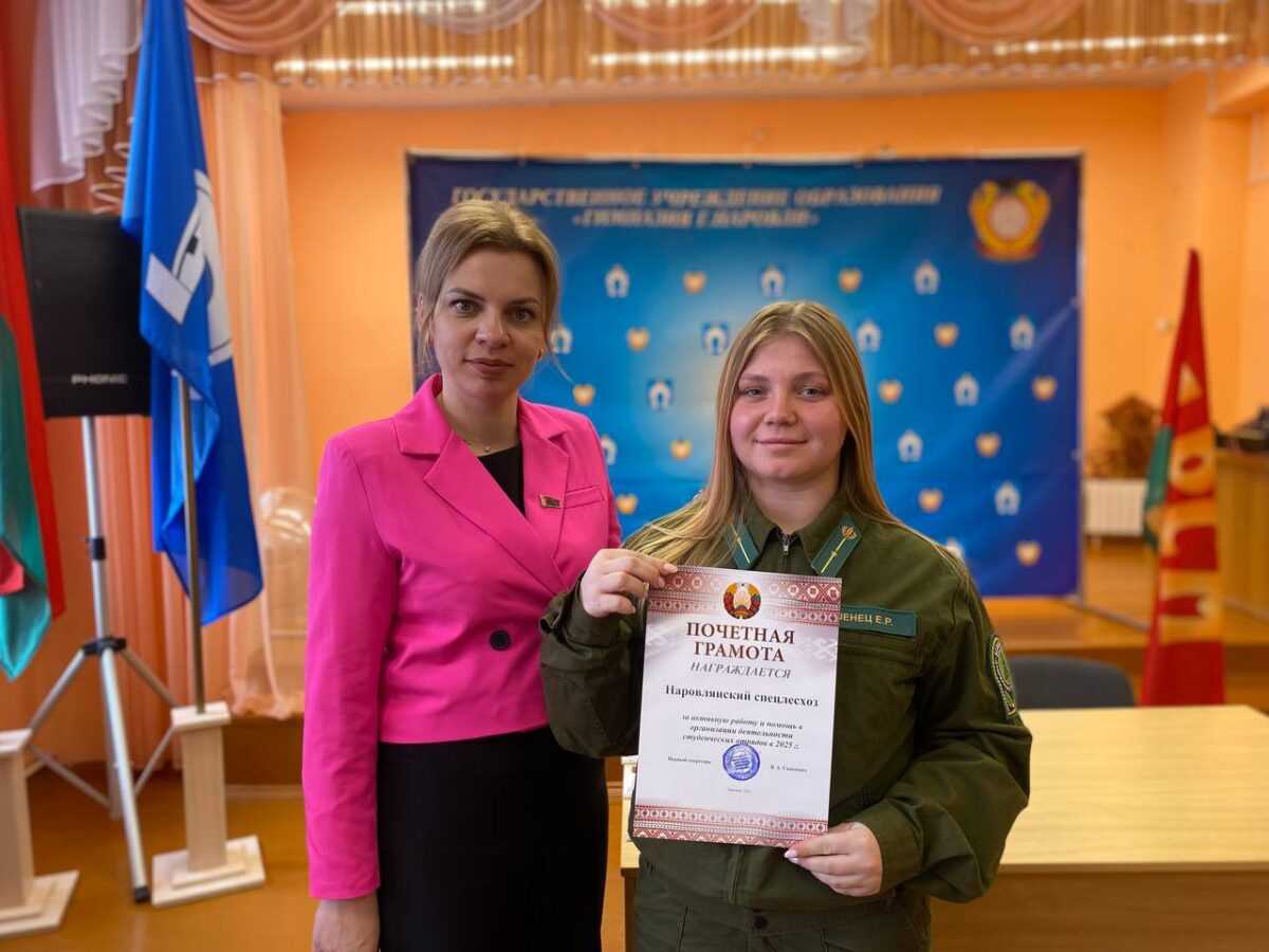 Благодарность за активное сотрудничество и поддержку РК ОО «БРСМ» в реализации молодежных инициатив была вручена Инге Пархоменко, специалисту сектора пропаганды и взаимодействия с общественностью Наровлянского РОЧС. Благодарность за активную работу и помощь в организации деятельности студенческих отрядов в 2025 году объявлена спецлесхозу.
