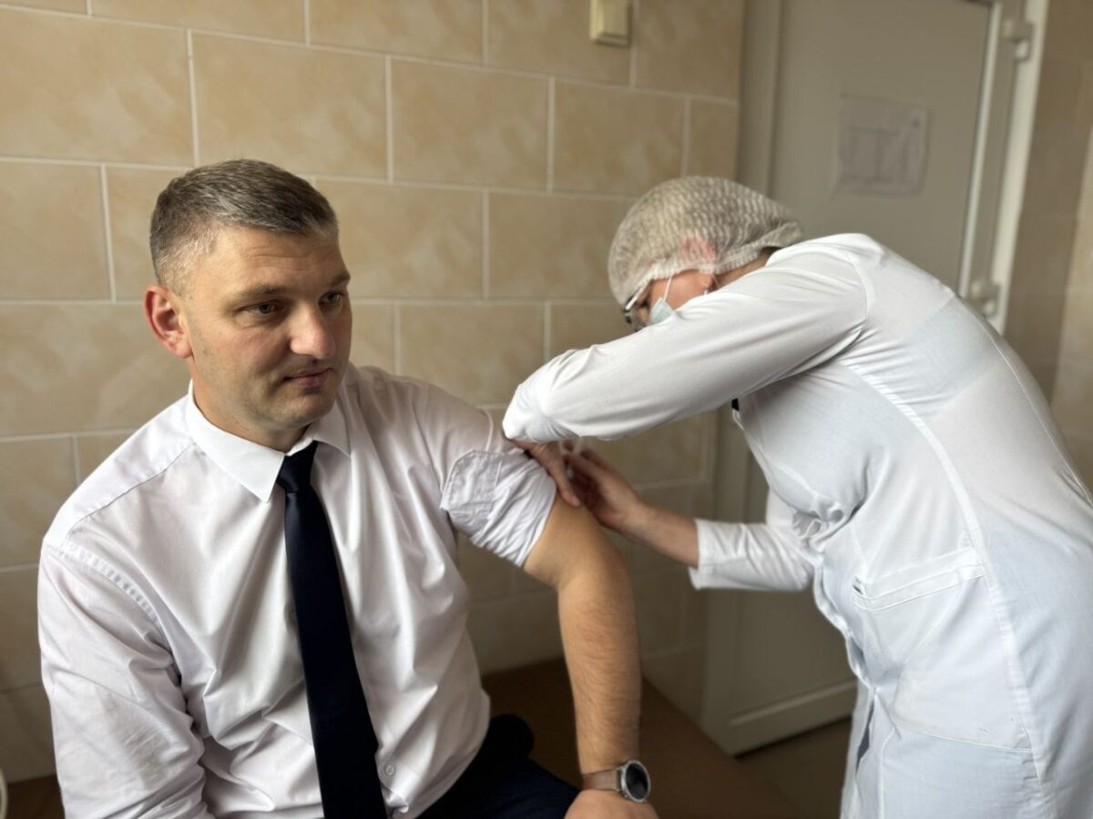 Председатель Наровлянского райисполкома Денис Ядченко и главный врач Наровлянской ЦРБ Иван Афанасенков стали первыми, кто сделал прививки от гриппа и COVID-19, подав личный пример и тем самым подчеркнув важность этой процедуры.